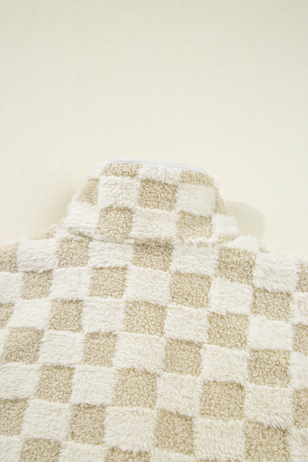 Khaki Sherpa Checkerboard Snap Button Vest Jacket