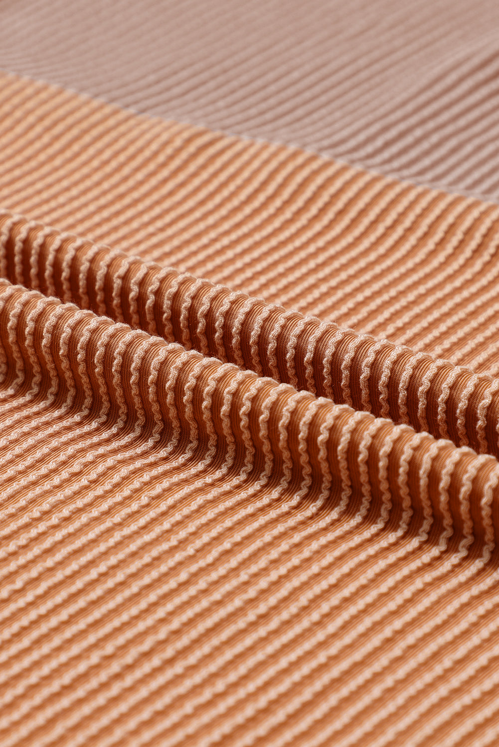 - This top features a unique color block design with contrasting panels that create a bold and eye-catching look.