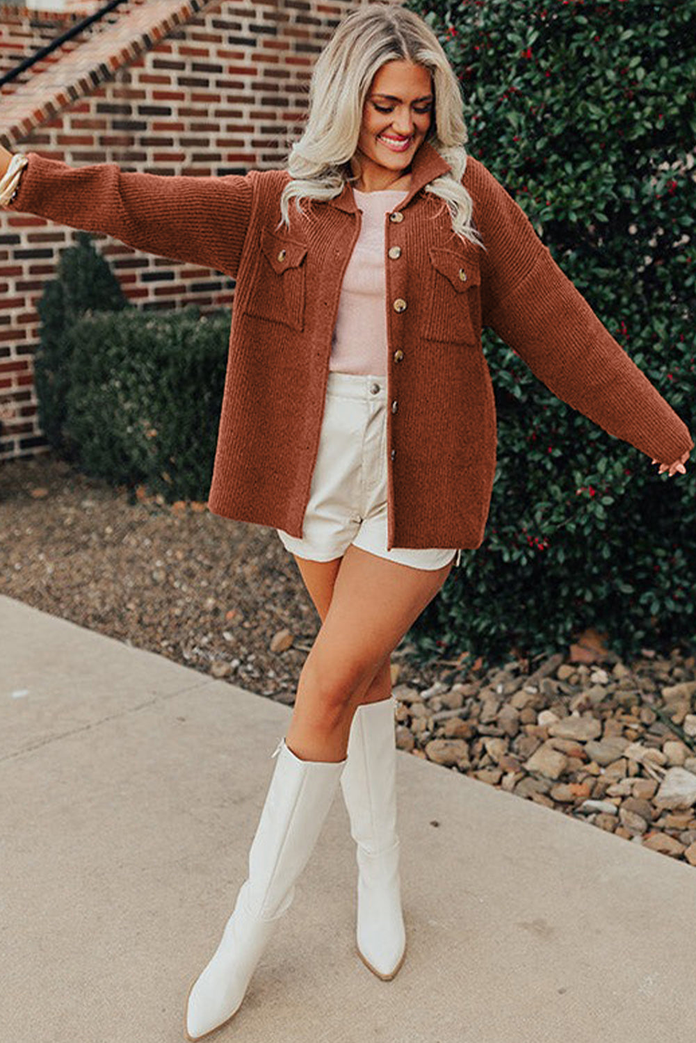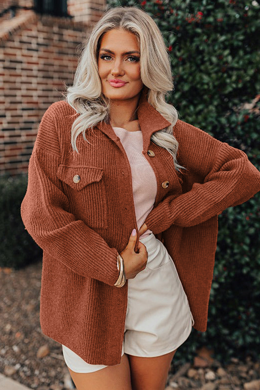 Red Sandalwood Ribbed Knit Buttons Front Flap Pocket Casual Shacket
