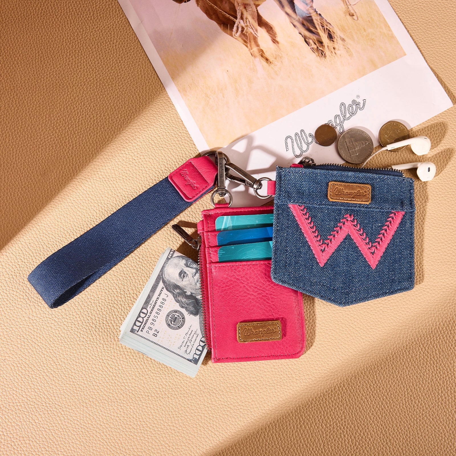Wrangler logo "W" Embroidered Dual Pouch Wristlet -Hot Pink